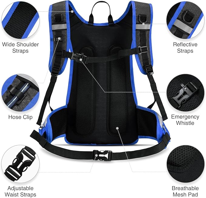 - PERFECT OUTDOOR GEAR - The 3L hydration bladder backpack has reflective strips on both sides and waist pockets, that can reflect lights at night and safeguard your riding. A safety whistle on the chest strap helps you get attention in an emergency. And the unique multifunctional helmet clip can fix your riding helmet when not in use, which is undoubtedly the perfect choice for biking.