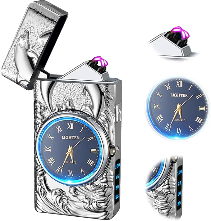 - 🐬【Exquisite Design】 This electronic lighter features exquisite embossed engraving, dazzling clock, inlaid with blue cat's eye stones, and cool lighter with LED lighting at the bottom. The noble and luxurious appearance adds more fashion for you.