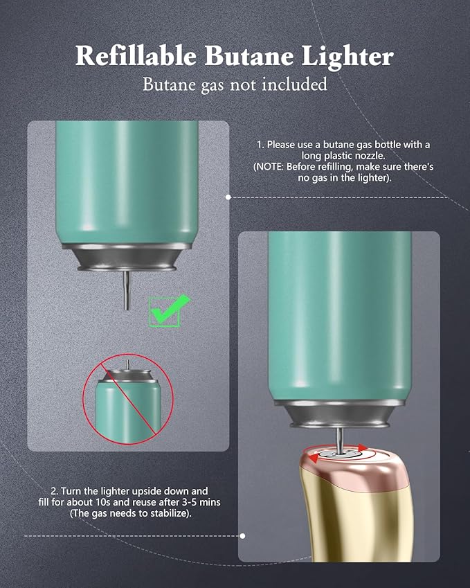 - Refillable & Adjustable Butane Lighter - Compared with disposable lighters, just get this refillable butane torch lighter and choose a butane gas canister with a long nozzle to start your journey at any time (Butane Gas Not Included). Please pull out the flame adjuster knob and turn the flame height as your need.