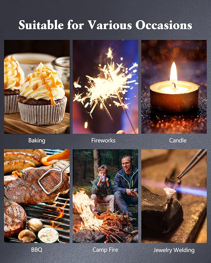 - Versatility & User-Friendly Design - With an ergonomic design to fit in your hand, you can use it comfortably for a long time. Just press the button to ignite and adjust the flame size through the flame regulator. It's great for candles, fireworks, BBQ grills, culinary,and camping.