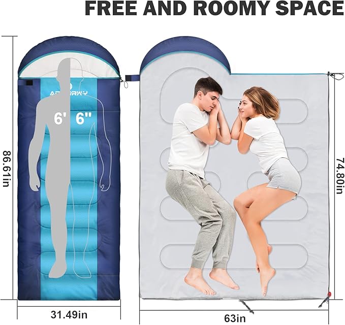 - DESIGNED FOR SPRING, SUMMER and FALL - Thick and breathable anngrowy sleeping bags designed for 3 seasons(59℉-77℉). Moreover, the kids/adult sleeping bag is made of waterproof and tear-resistant polyester fabric to keep you warm even in extreme conditions and prevent you from any dampness, this is achieved through double-filled technology.