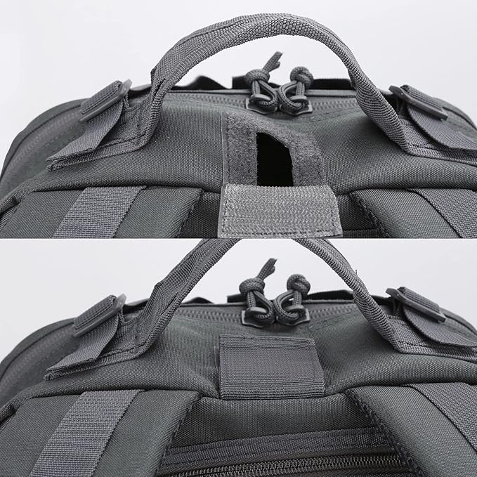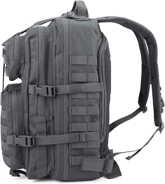 - TACTICAL BAG PACK: The back of tactical bag and adjustable shoulder straps are ventilated mesh padded, breathable and comfortable. Tactical backpack for men with double-stitched, Heavy duty zippers and utility-style cord pulls, Side and front load compression system to adjust and tighten backpack.