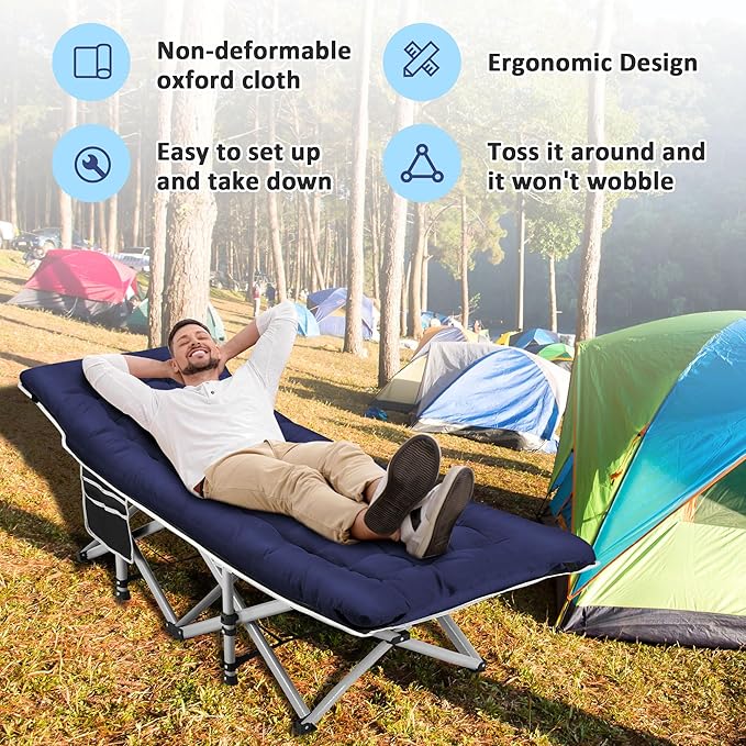 - Folding Bed with Mattress: For the most comfortable sleep experience, our sleeping cot deigns with a 2.5-3 inch thick, skin-friendly, material-split mattress. Note: The mattress is removable so you can take it off when it gets too hot.