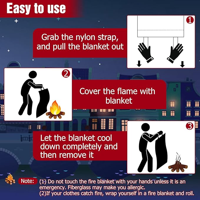 - Easy to use: Our fire blankets emergency for home is very simple to use, you just need to follow the steps below. First, open the bag and take out the blanket by holding the black tie with both hands. Then unroll the blanket, throw the fire blanket against the fire, or wrap yourself in the blanket.
