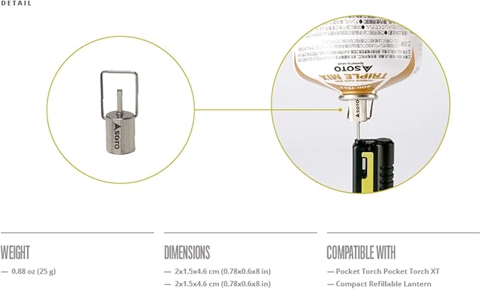 - COMPATIBILITY – It may be used with the Pocket Torch Extended and/or SOTO’s Compact, Refillable Lantern. Also compatible with many other refillable lighters