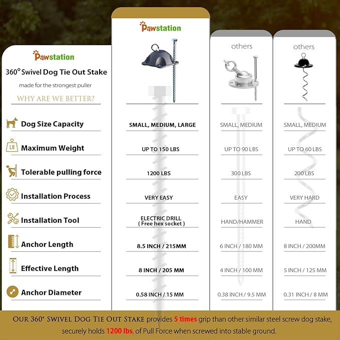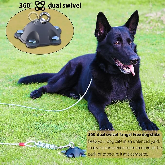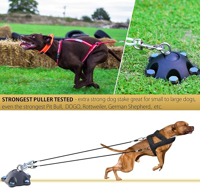 - ❤ NO PULL OUT OF GROUND GUARANTEE: If you’re looking for a dog tie out stake and dog yard leash stake for a big dog or for a strong puller, this is the perfect dog stake for you here. This swivel dog stake is the strongest and most reliable dog anchor on the market.It has been tested in stable ground to securely hold 1200 lbs. of pull force when installed with the 5 included screw Anchor Stakes. Great for the strongest puller.