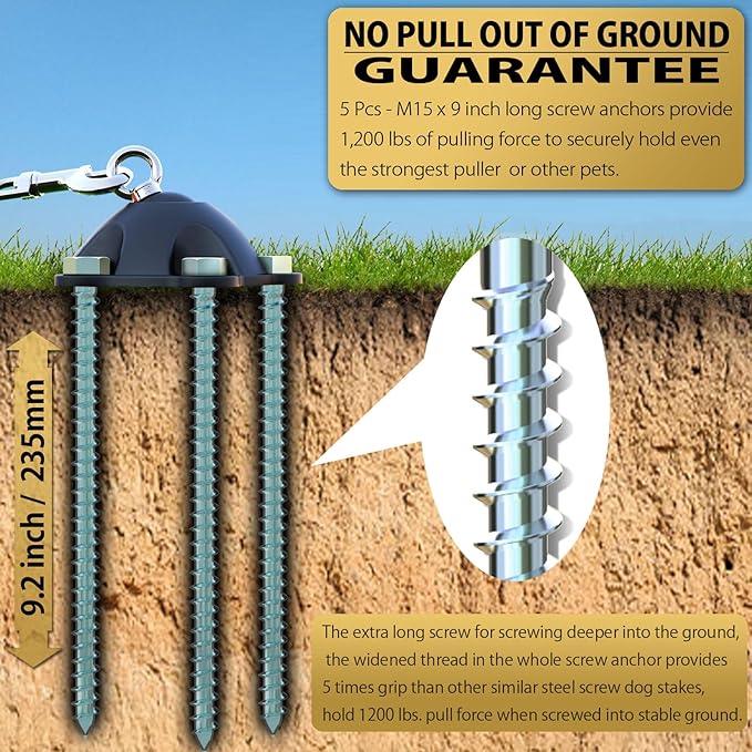 - ❤ SECURE ANCHORING SYSTEM: Features 5 screw ground anchors, made of durable and strong nylon + fiberglass material, 9 inches long for screwing deeper into the ground, the wider thread provides 5 timesgrip than other similar steel screw dog stake, securely holds real 1200 lbs.of Pull Forcewhen screwed into stable ground.