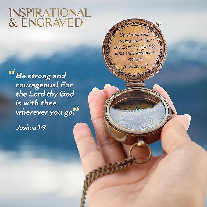 - Inspirational Inscription - Engraved on the reverse side is the inspirational scripture from Joshua 1:9 (“Be Strong and courageous! For the Lord thy God is with the wherever you go”) & it serves as a means to remember the Lord always and to keep our focus on Him--our Guide & True North. Over 2 inches in diameter our compass hangs beautifully on the included 6 inch gold display