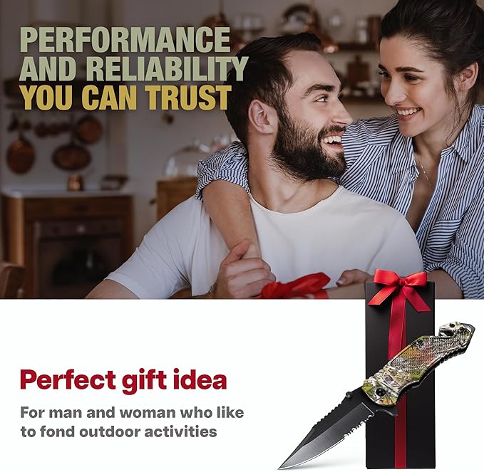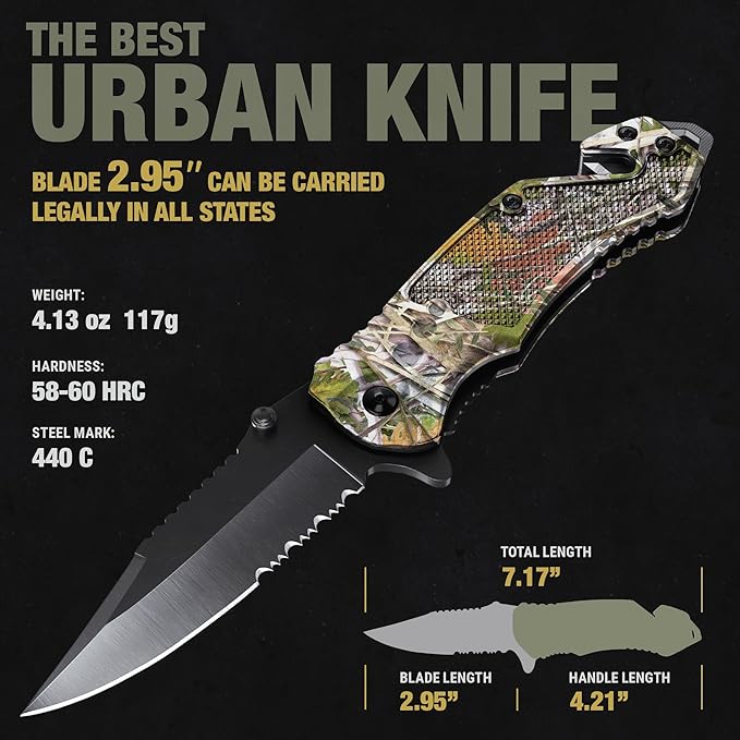 - Beautiful and Stylish Design: A perfect combination of a black steel blade with a stylish aluminum green camouflage handle. Army tactical pocket knives for men. Ideal for hunting, tactical use, and tools. The best knife in mossy oak color for collectors in the category of Hunting & Tactical Knives & Tools. A perfect choice for campers, hikers, hunters, fishermen, and enthusiasts.