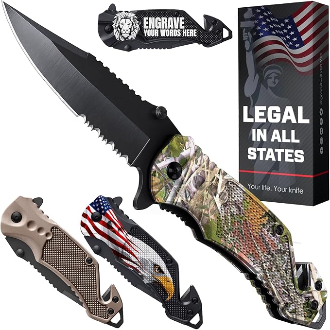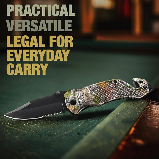 - Camo design. A compact, functional, and stylish tactical knife. This common pocket knife is legal to carry in all states of the United States. With the handy pocket clip and a hole for a lanyard, it is simple to use and excellent for everyday carry.