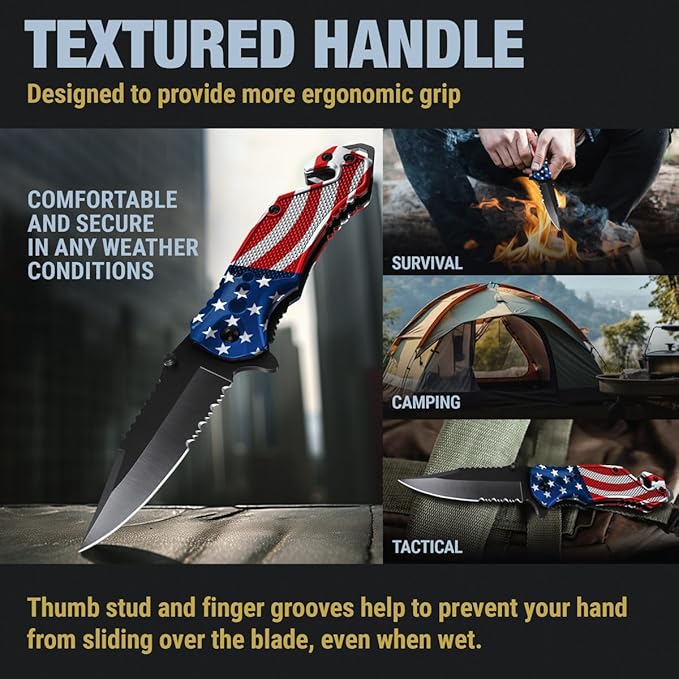 - Perfect Everyday Accessory: Our American flag hand folding knife is the perfect accessory for any proud American. Its sleek and compact design makes it an ideal everyday carry item. Whether you're celebrating Independence Day on the 4th of July or just want to showcase your love for the USA, this knife is a symbol of your dedication. Gift for retired men, travelers, outdoorsy men, military men, fisherman, country boy, cyclists, hunters, campers, marines, working men, hikers.