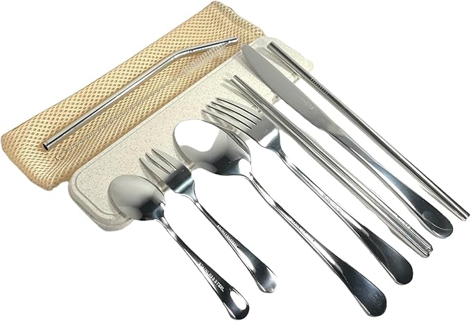 - PORTABLE: Designed in USA, this cutlery set with 11 pcs contains dinner knife, fork & spoon, chopsticks, dessert spoon & fork, straight & bent straw, straw cleaning brush, carrying case, and mesh bag