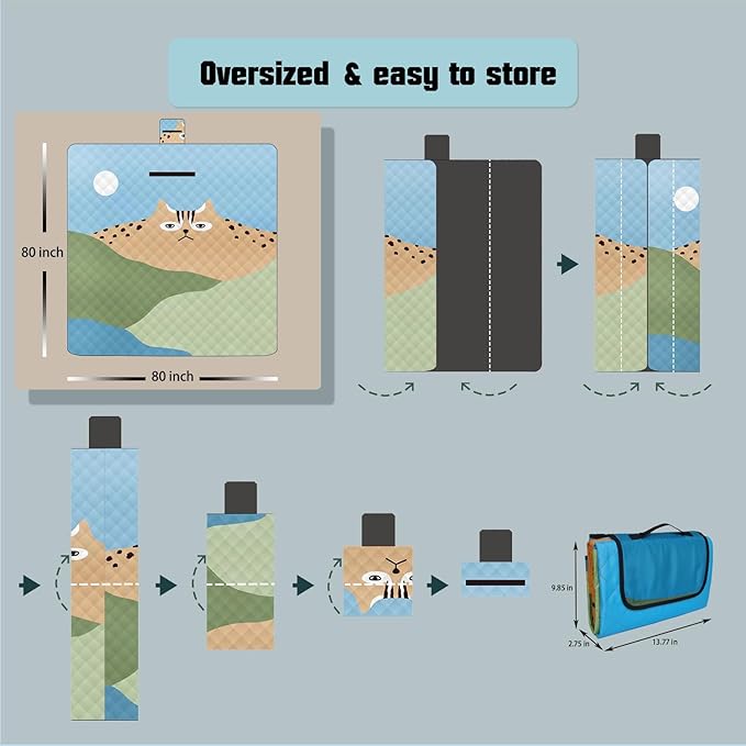 - 【Oversize & Portable】This three-layer waterproof and sand proof picnic mat/beach mat, with a unfolded size of 80*80 inches, can accommodate 4-6 people, is spacious and comfortable, and can accommodate food, tableware, daily necessities. It is very suitable for picnics, beach parties, camping, and more. After folding, the size is 9.8*13.7 inches, which is very portable and does not take up too much space.
