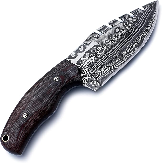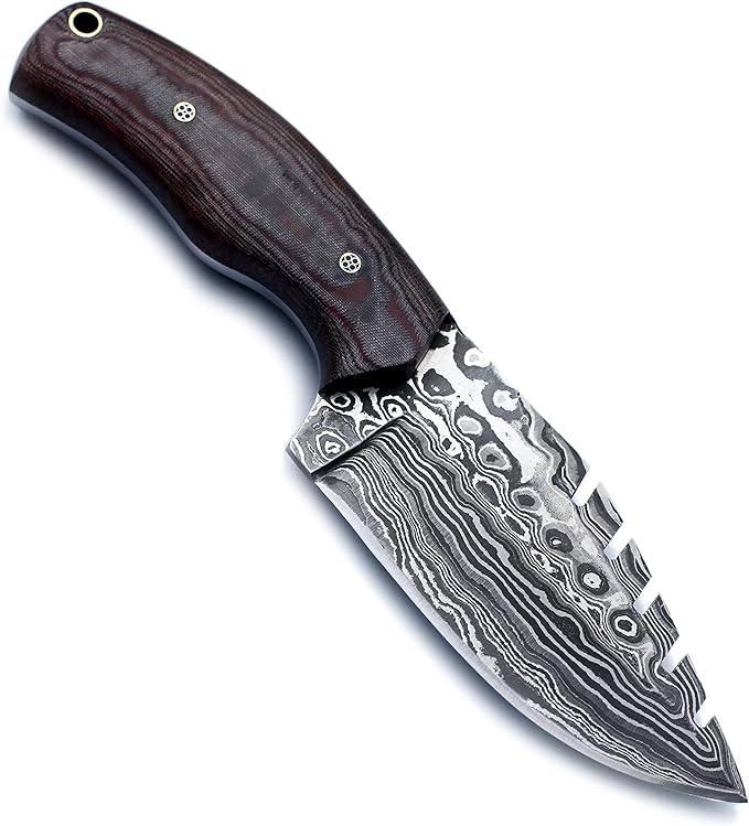 Handmade Damascus Steel Knife for Hunting,Survival,Camping,Bushcraft,and Fishing-Fixed Blade Drop Point with Saw back Full Tang Micarta Handle with Cowhide-Leather Sheath - WKD-773