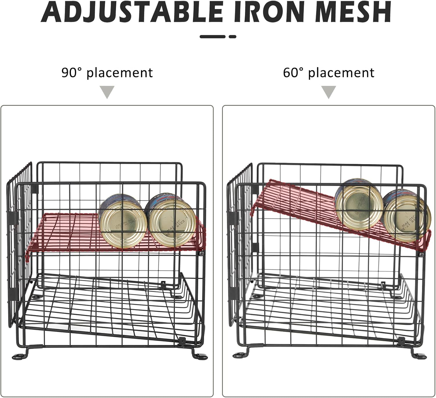 - 【STURDY AND DURABLE】Our can storage organizer is made of strong iron material, the iron wires on the peripheral edges are thickened, and divider mesh is fixed with screws for sturdiness and durability. Can holders for pantry can withstand the heavy cans and not easy to bend and collapse.