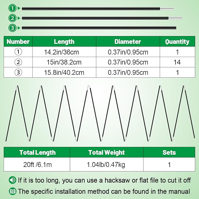 - Package Included: You will receive an 16-section tent pole replacement with a total length of 20 feet, an elastic rope, four male pole tips, four washers, and an instruction manual. With these replaceable tent pole repair kits, you can easily replace broken poles for tents.