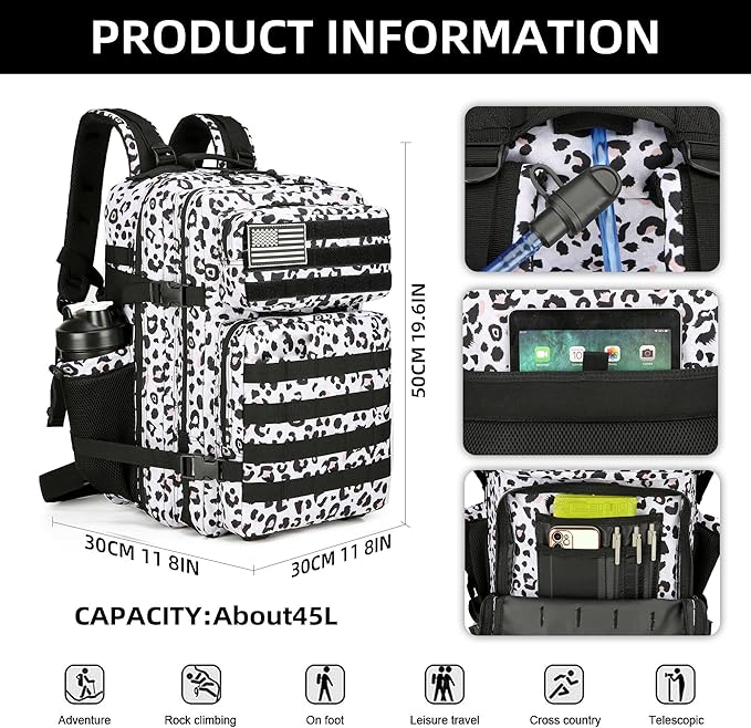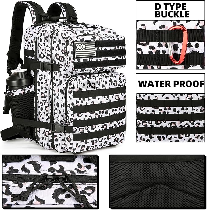 - The tactical backpack has molle system, there are plenty of mounting points on the outside of the tactical backpack for additional bags, designed to be used in combination with other equipment, you can load pockets, water bottle bags, accessory bags, etc.