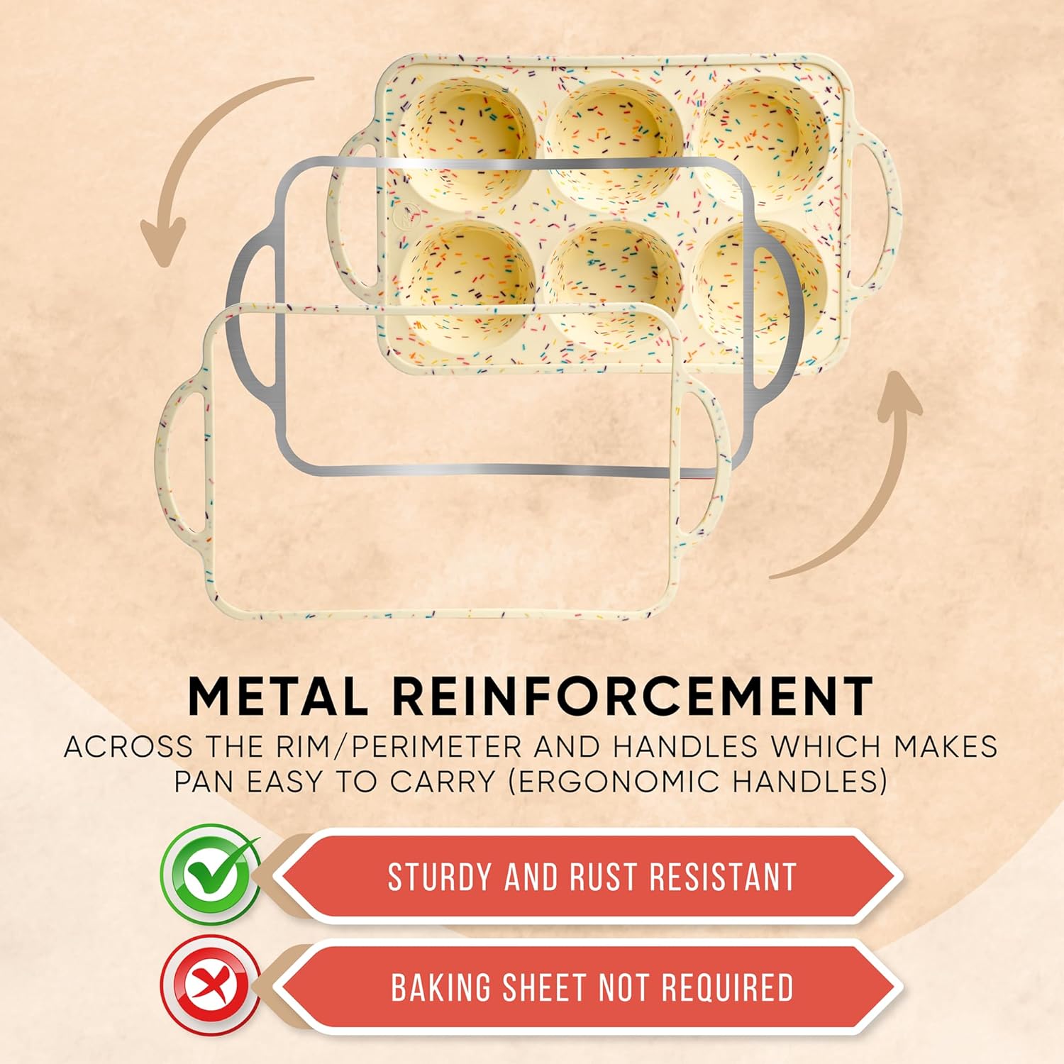 - No More Floppy Mess – Built-in Metal Frame for Stability: Say goodbye to spills and warping! The Bake Boss muffin pan silicone design includes reinforced metal handles, so you can move your muffins from counter to oven without needing a support tray.