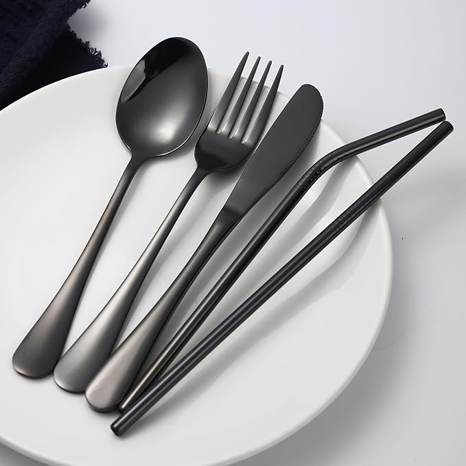 - 7-Piece Reusable Utensils with Case:includes 1 x dinner knife,1 x dinner fork, 1 x dinner spoon, 1 x dinner Straight straw,1 x dinner Bended Straw ,1 x Special brush for straw,1plus travel flatware carrying case,suitable for restaurant, travel, camp, school or workplace...