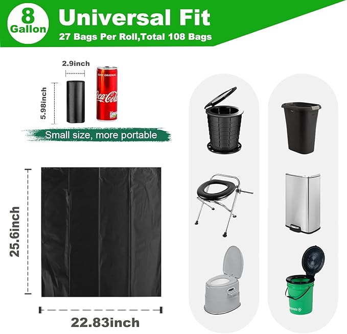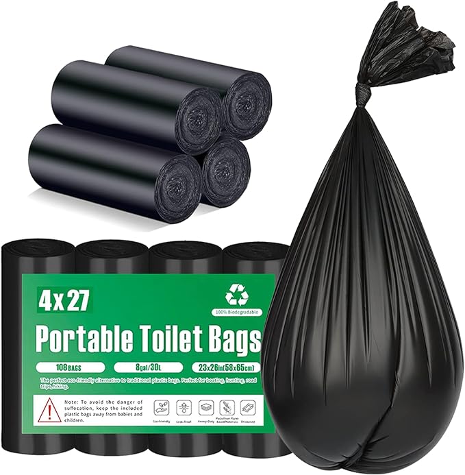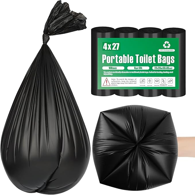 - 【108 Portable Toilet Bags for Buckets】27 count biodegradable toilet bags per roll, total 4 rolls, 108 camping toilet bags you can get. You'll get more and better quality for less money than other compost toilet bags for portable potty on the market.