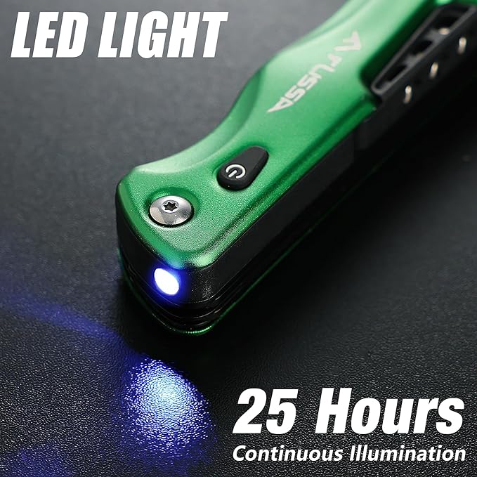 - Special Design: The built-in LED light can illuminate continuously for 25 hours, allowing you to handle problems in dark environments. The hammer can be used to break glass in an emergency to protect your personal safety. The bits storage of the multi function tool allows the bits to be better organized, making them less likely to be lost.