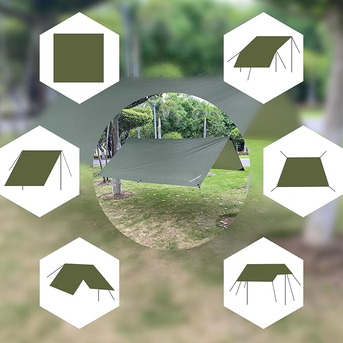 - ✯𝐌𝐮𝐥𝐭𝐢𝐟𝐮𝐧𝐜𝐭𝐢𝐨𝐧 𝐔𝐬𝐞 - Our tent tarp can be a good outdoor campanion that perfect for you use in various occasions. You can not only ues it for camping, traveling, hiking, backpacking, picnicas as sun canopy or rainfly, but also unfold it and lay on ground use as a tent footprint.