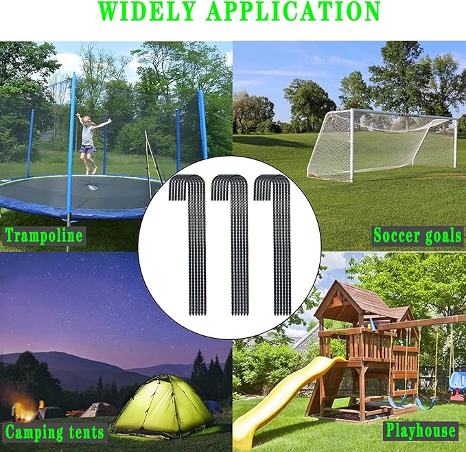 - 【MULTIPLE USES】These J hook ground stakes help you to hold down the swing sets, slides, fences, yard decorations, tents, nets, prevent the tents or sheds from slipping away in winds.