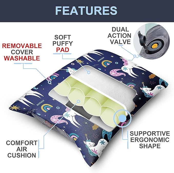 Girls Inflatable Camping Pillow Lite Kids w. Removable X-Form Padded Cover | Unicorn Rainbow | Comfort, Washable, Compact, Ultralight, Packable | Backpacking Hiking Travel Air Sleepover Scout