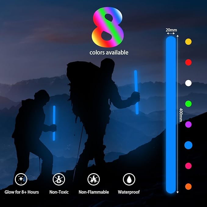 - 【Emergency Lighting Function】Our big glow sticks are military grade bright light sticks,mainly applied for emergency situation.They will provide efficient and reliable lights in power outage,natural disasters(like earthquake,hurricane),or other unexpected situations where electricity may not be available.These light up sticks also are good partners for camping bags, suitable for diving,exploration,camping, night riding, fishing, hiking, field and so on