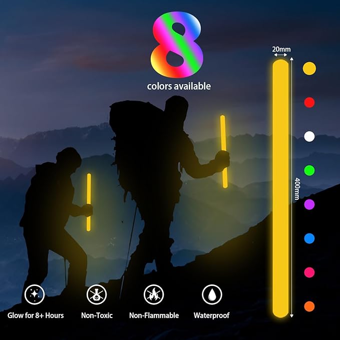 - 【Emergency Lighting Function】Our big glow sticks are military grade bright light sticks,mainly applied for emergency situation.They will provide efficient and reliable lights in power outage,natural disasters(like earthquake,hurricane),or other unexpected situations where electricity may not be available.These light up sticks also are good partners for camping bags, suitable for diving,exploration,camping, night riding, fishing, hiking, field and so on