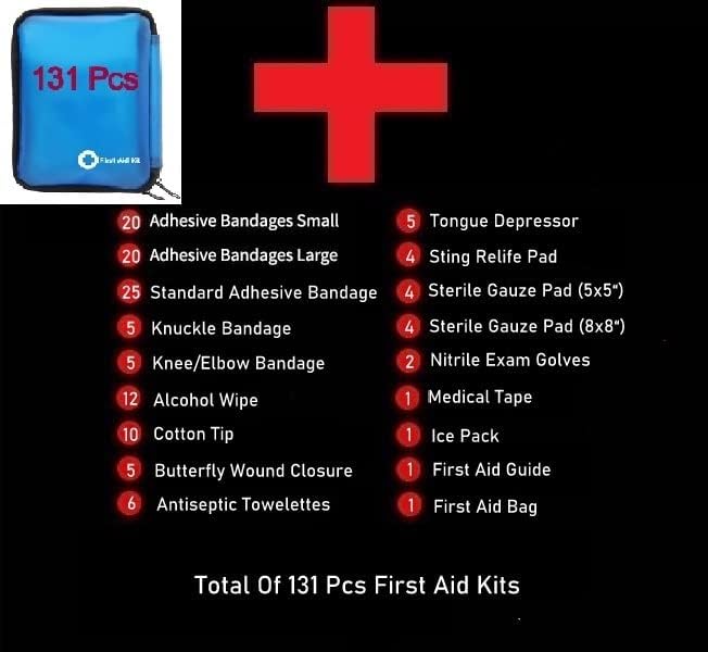 - ✅ FIRST AID MEDICAL CONTAIN: Medical first aid kits contains 75 different size bandages, 8 Gauze relief Pads , Cotton tip (10), Cleaning wipe (12), Antiseptics towelettes (6),Tongue Depressor (5), Butterfly wound closures (5), Sterile pads (4), Nitrile Exam Golves (2), Medical tape , Ice Pack, First Aid guide, Blue medical tote bag. Total of 131 Pcs.