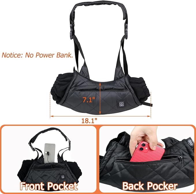 - 【Two Storage Pockets & Adjustable / Detachable Waist Belt】Two practical zipper storage pockets, the top is a item storage pocket, which can be used to store phone, wallet, glasses, keys, tissues etc. keeps your valuables extra secure. In the middle is a battery storage pocket to store power bank. The two sets of plastic clasps of the heating hand pouch and the adjustable/detachable waist / shoulder belt allow you to tie it on your waist or hang it around your neck.【NO POWER BANK】