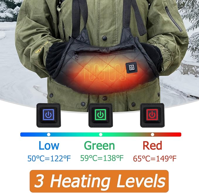 - 【3 Temperature Control】 The heated hand muff with pockets has 3 adjustable heat settings Red - High: 65℃/149℉; Green - Medium: 59℃/138℉; Blue - Low: 50℃/122℉. Press and hold the button for 2-3 seconds to display the red light to start heating, depending on the ambient temperature, you can easily switch between the 3 heat settings.【NO POWER BANK】