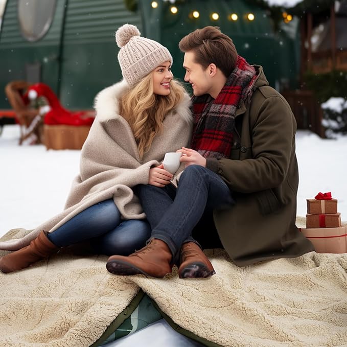 Outdoor Camping Blanket with Sherpa Lining, Extra Warm Thick Camp Blankets & Puffy Ultralight Soft Poncho DWR Camping Quilt for Cold Weather, Adventure,Sleeping,Backpacking 78"x 56"