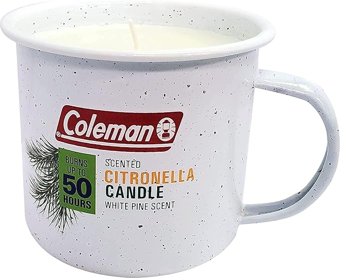 Coleman Scented Outdoor Citronella Candle in Tin Mug, Pine Scented Rustic Outdoor Camping Candle, Up to 50h Burn Time