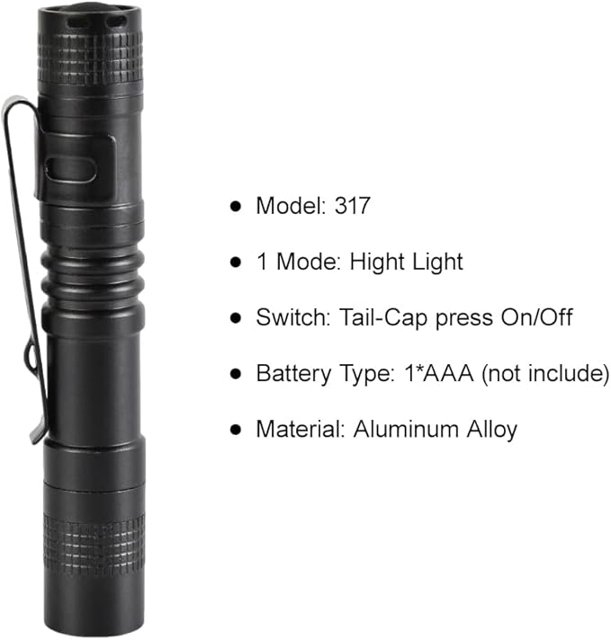 - [POCKET SIZE] Height 3.5 inches, the pocket flashlight with clip is designed in a small body shape to fit in your pants pocket, belt or backpack. This mini flashlight is powered by 1 AAA battery (battery not included).