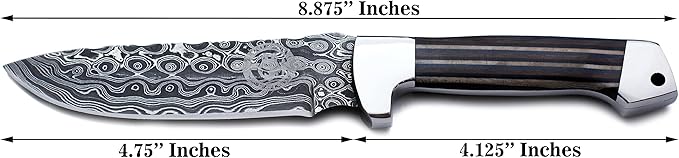 - 🗡:KNIFE DIMENSIONS: It is best as a Hunting, Survival, Camping, Skinning and Tracking Knife a complete Package of an Outdoor Adventures. 8.875 inch Total Length, 4.75 inches Blade and 4.125 inches Handle.