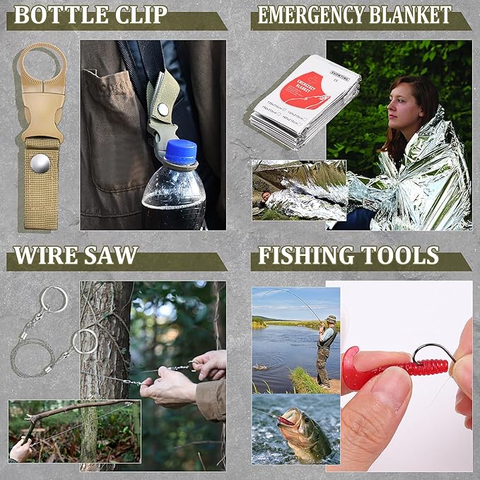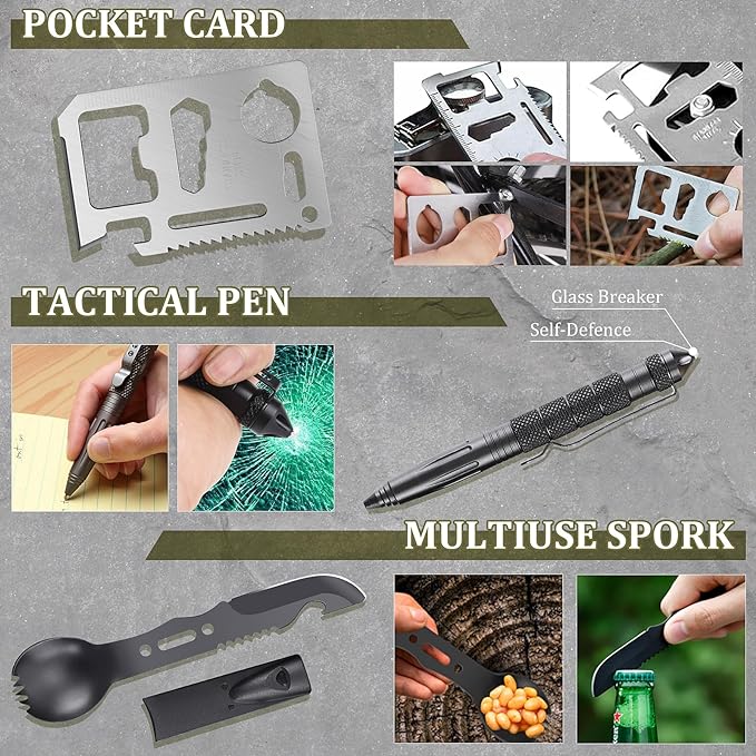 - 【High-Quality Emergency Kit】The survival kit includes high-quality tactical gear that are carefully selected to ensure durability and functionality. It features many multi-tools such as tactical pen, survival bracelet, multifunctional card, multi-use spork, and 14 in 1 hatchet, ensuring you have the necessary tools for any task at hand. Moreover, the kit contains some practical camping tools, like fire starter, emergency blanket, fake shrimp bait, wire saw, bottle hanging buckle.