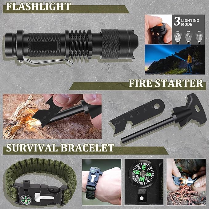- 【Versatile and Essential Survival Kits】The 14 in 1 survival kit is a comprehensive emergency kit designed to meet the needs of outdoor enthusiasts, adventurers, and emergency preparedness. Packed with essential tactical survival tools and supplies, the survival kit allows you to focus on enjoying your outdoor activities or staying safe during unexpected events. It’s a reliable companion for camping, hiking, hunting, fishing, and wild adventures.