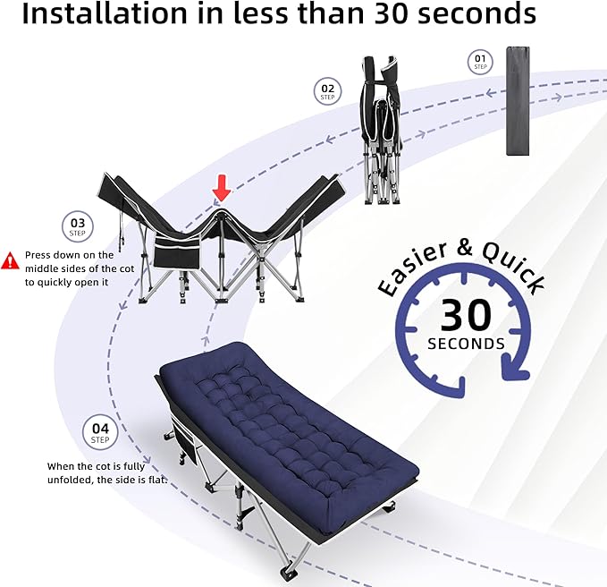 - How to Open the Folding Cot: Pls follow the picture 4 to open the cot: first, release the belt buckle, and then press down on the middle part on both sides (in the direction of the arrow) to fully unfold the camping cot.
