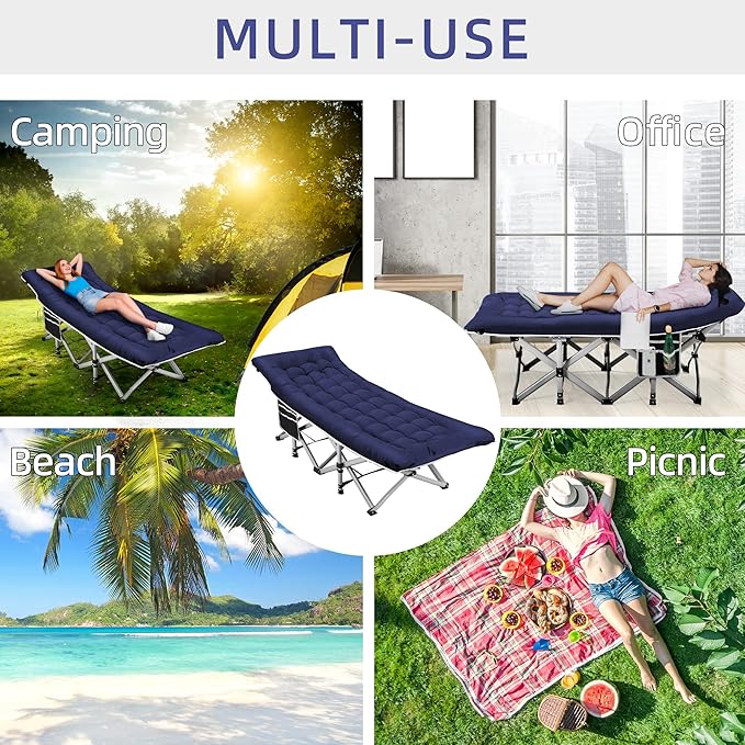 - 28" Extra Wide & 18°Tilt Design: The 28-inch wide camping bed is perfect for adults. The top of the cot is tilted 18°to make your head more comfortable when lying down, provide comfortable sleep to you. The sleeping bed can be used for camping, home and office and is perfect for nighttime rest, family naps and office breaks.