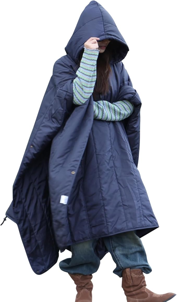 DUKUSEEK Outdoor Wearable Camping Blanket with Hood, Large Packable Backpacking Hooded Stadium Blankets, Lightweight Warm Quilt for Picnic, Hiking, Football, 79"x59"