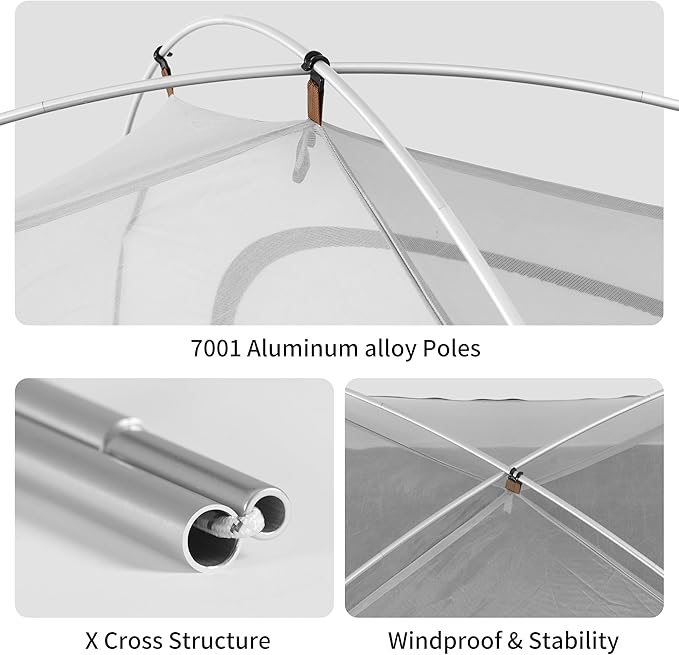 - Easy Setup Tent for Camping: The tent is X cross structure with 7001 aluminum alloy tent poles, one can easily set up the tent in 5 minutes, and high quality aluminum alloy poles is tough, durable and more lightweight than the usual fiberglass poles.