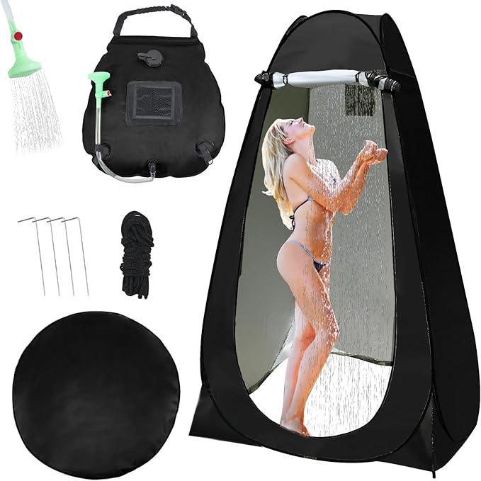 - 【Multi-Purpose】Portable pop up shower tent for camping can provide you with a clean and private space anytime, anywhere. Our portable privacy tent is fully equipped to make sufficient preparations for going out, including 1x Camping Shower Tent, 1 x Carrying Bag, 4 x Metal Mounting Stakes, 4 x Windbreak Rope, 1 x Solar Shower Bag. You can take this practical , convenient and pop up tent, for changing clothes, camping, beach, shower, toilet,hiking,taking pictures or anywhere you need privacy.