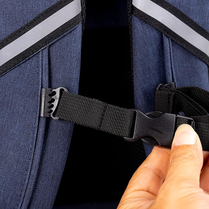 - Features an easy-access, splash-proof outer zipper pocket with a reflective stripe; the shoulder strap includes reflective stripes and an adjustable sternum buckle; a waist strap provides additional support and relieves pressure