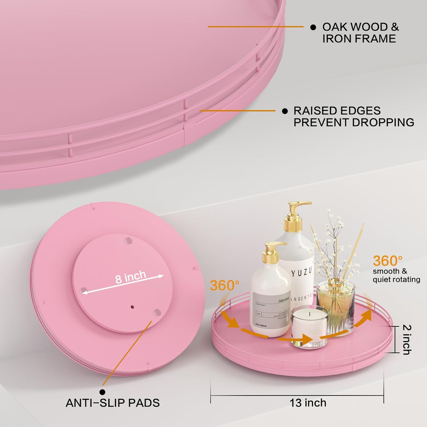 13" Oak Wood Lazy Susan Organizer, Lazy Susan for Cabinet Dining Table Pantry Wood Turntable Organizer Tray for Coffee Table Kitchen Countertop Spinning Spice Can Organization and Storage Round Pink