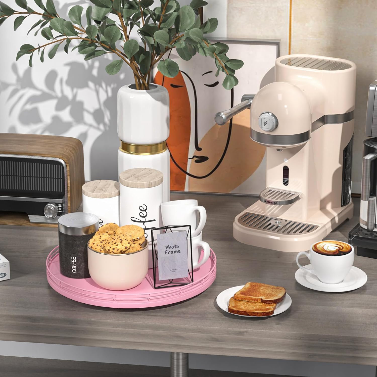 - ๐ง๐ต๐ผ๐๐ด๐ต๐๐ณ๐๐น ๐๐ฒ๐๐ถ๐ด๐ป: The turntable tray features a smooth and silent 360ยฐrotation; Bottom slip-resistant pads for stability and protect your countertop from scratches; Raised edges on each organizer tray to keep items from falling out; Easy to use, no installation required