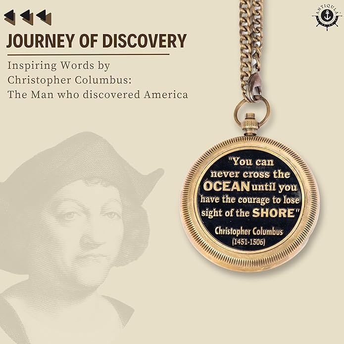 - ✔ EMBRACE INSPIRATION AND COURAGE: Introducing the captivating Columbus Compass—a vintage treasure. An ideal gift for dreamers and adventurers, it enchants with its timeless allure. Skillfully handcrafted, it showcases an engraved quotation by Christopher Columbus on its backside: "You can never cross the ocean until you have the courage to lose sight of the shore." Perfect for graduation gifts for boys, baptism gifts for boys, and confirmation gifts for teenage boys, and much more.