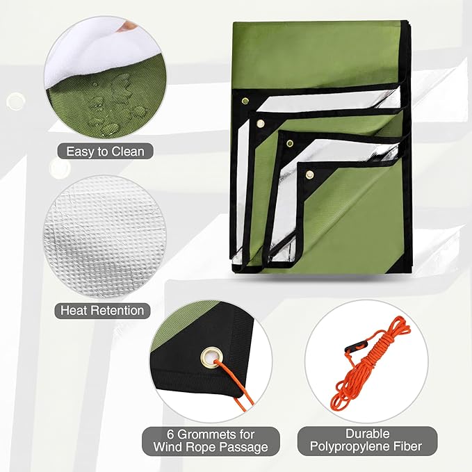 - Durable Materials: The space blanket is made of non-woven fabric which is breathable and environment-friendly, durable polyester mesh, and aluminum mylar coating. The wind rope is made of durable polypropylene fiber. It can be used as car protection, picnic mat and pet’s shelter.