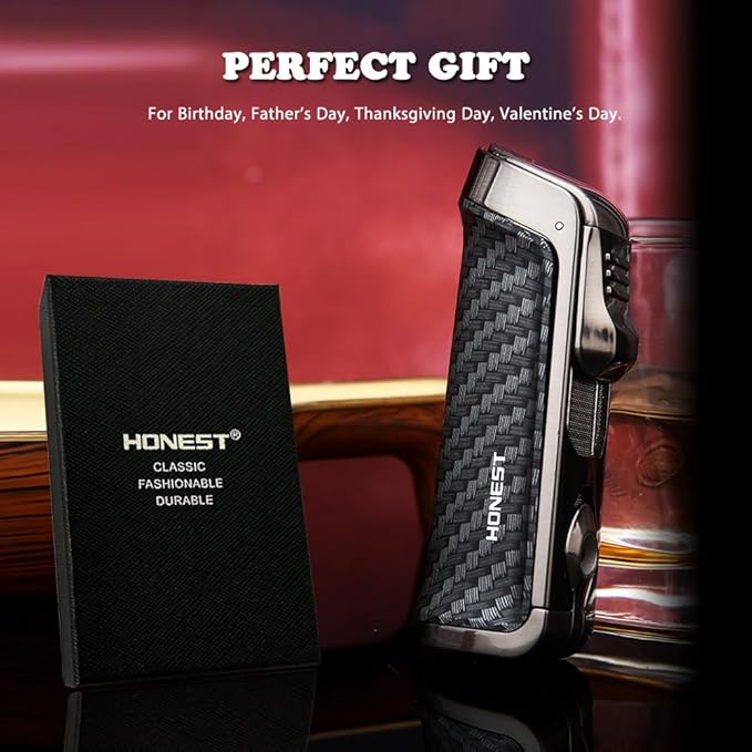 HONEST Triple Jet Torch Lighter Built-in Punch Visible Gas Window Refillable Gas Adjustable Flame Intensity Pocket Lighter Gift for Men BBQ Kitchen Fireplace Candle (Carbon Wrap)